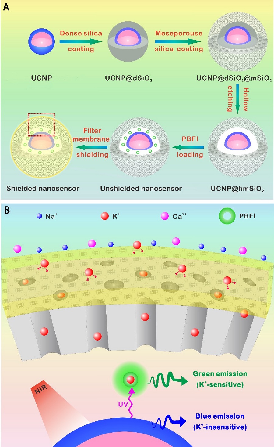 圖注:鉀離子納米探針的設(shè)計以及感應(yīng)機理。(A) 鉀離子納米探針的制備過程。上轉(zhuǎn)換發(fā)光顆粒NaYF4:Yb/Tm@NaYF4:Yb/Nd 表面連續(xù)包裹一層實心二氧化硅和一層介孔二氧化硅。刻蝕實心二氧化硅成留下的空腔結(jié)構(gòu)可裝載鉀離子熒光指示劑。最后,外表面包裹一層鉀離子特異性的薄膜即成鉀離子納米感應(yīng)探針。(B) 鉀離子納米探針的感應(yīng)機理。外層薄膜只允許鉀離子進出納米探針,同時排斥其他陽離子。在近紅外光激發(fā)下,內(nèi)核上轉(zhuǎn)換發(fā)光顆粒發(fā)出的紫外光可作為鉀離子熒光指示劑的激發(fā)光,從而賦予探針近紅外光激發(fā)的功能。