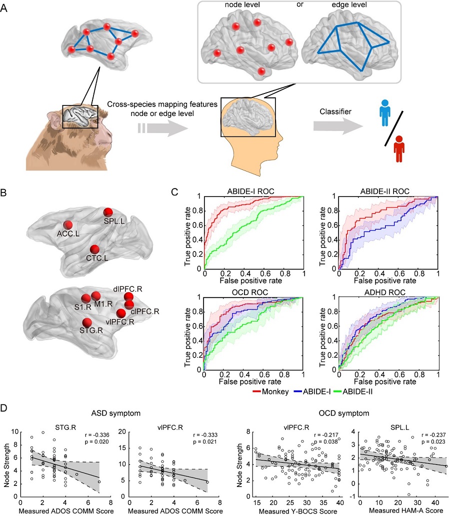 圖注:(A)腦功能連接圖譜的特征構建猴-人跨物種機器學習分類器;(B)在獼猴模型中學習得到的9個腦區;(C)基于9個腦區構建的跨物種機器學習分類器與基于人ASD數據構建的分類器對ASDOCDADHD的分類性能ROC曲線;(DASDOCD共享的神經環路內表型以及與疾病特異的臨床癥狀相關的異常。