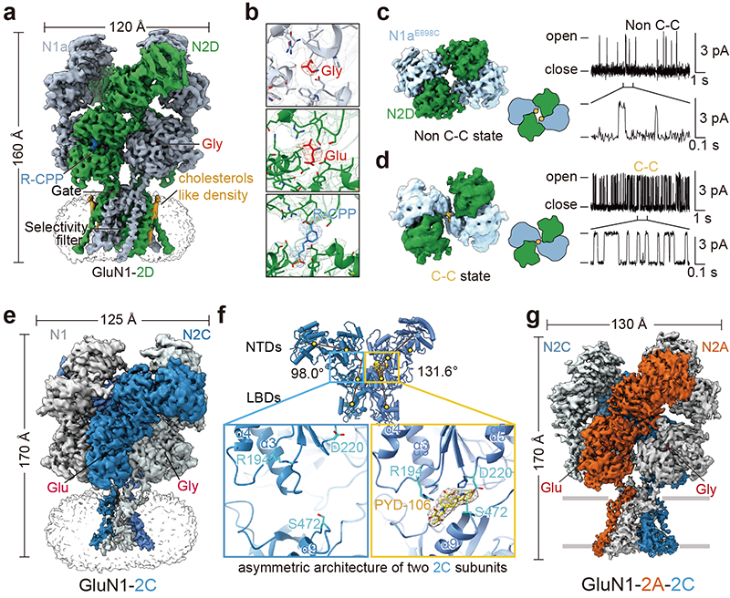 圖2. 含有GluN2D和GluN2C受體的三維結(jié)構(gòu)、門控機(jī)制和藥理學(xué)特性。a,GluN1-N2D受體的三維結(jié)構(gòu)。b, 甘氨酸、谷氨酸和競(jìng)爭(zhēng)性抑制劑R-CPP在其結(jié)合口袋中的電子密度云。c, d, GluN1E698C-N2D突變型受體在二硫鍵交聯(lián)和非交聯(lián)狀態(tài)下的三維構(gòu)象和單通道性質(zhì)。e, GluN1-N2C受體的三維結(jié)構(gòu)。f, GluN1-N2C受體的非對(duì)稱性構(gòu)象及選擇性變構(gòu)抑制劑PYD-106的結(jié)合口袋。g, GluN1-N2A-N2C受體的組裝模式和拓?fù)浣Y(jié)構(gòu)。