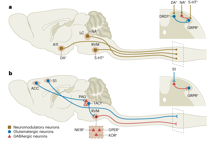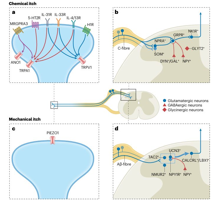 1.脊髓層面的癢覺信息處理與門控:脊髓背角存在處理化學(xué)性癢與機械性癢的微環(huán)路。脊髓背角中,表達胃泌素釋放肽受體的神經(jīng)元是化學(xué)性癢信號處理的關(guān)鍵節(jié)點;而表達UCN3、神經(jīng)肽Y1受體等的興奮性中間神經(jīng)元群體則特異性介導(dǎo)機械性癢。這些通路的活動受到多種抑制性神經(jīng)元(如表達神經(jīng)肽Y、甘丙肽或強啡肽的GABA能神經(jīng)元)的精密門控,其功能失調(diào)是導(dǎo)致自發(fā)癢和癢覺超敏的重要機制。