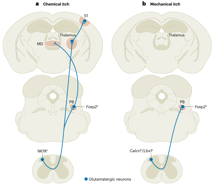 癢覺是一種進化上保守的防御性軀體感覺,通過激發(fā)搔抓行為移除體表有害物質(zhì),對機體生存至關(guān)重要。然而,當(dāng)其轉(zhuǎn)變?yōu)槁责W時,則構(gòu)成重大的臨床挑戰(zhàn)。慢性瘙癢廣泛存在于特應(yīng)性皮炎、肝病、腎病衰竭等多種疾病中,并常伴隨嚴(yán)重的焦慮等負性情緒,極大地影響患者的生活質(zhì)量。近年來的研究已在分子層面揭示了癢覺的外周轉(zhuǎn)導(dǎo)機制——例如,在初級感覺神經(jīng)元中,組胺、5-羥色胺等化學(xué)性癢覺刺激通過H1R、5-HT2Rs等G蛋白偶聯(lián)受體及下游TRP離子通道介導(dǎo);而機械性癢覺則主要由PIEZO1通道轉(zhuǎn)導(dǎo)。中樞神經(jīng)系統(tǒng)如何接收、整合并詮釋這些經(jīng)初級神經(jīng)元編碼的癢覺信號,進而形成定位清晰的癢覺感知、驅(qū)動搔抓行為,其完整的神經(jīng)環(huán)路仍是亟待深入解析的核心問題之一。孫衍剛研究員的綜述正是旨在系統(tǒng)性地回答這一核心問題。