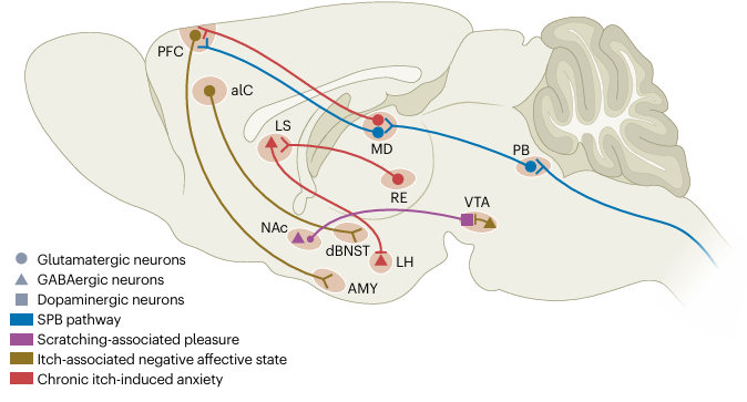 3.癢覺感知的腦內(nèi)神經(jīng)環(huán)路:文章進一步闡明了大腦對癢覺信息的分布式處理機制。在感覺層面,初級體感皮層(S1)通過群體編碼模式來表征癢覺,其反應(yīng)強度和激活群體大小共同編碼癢覺強度。更為關(guān)鍵的是,S1中小部分錐體神經(jīng)元在癢覺感知閾值附近表現(xiàn)出“點燃”樣的全或無反應(yīng)模式。在情感與動機層面,前島葉皮層等腦區(qū)是癢覺相關(guān)負性情感狀態(tài)(如厭惡)環(huán)路的核心腦區(qū)。此外,搔癢行為所誘發(fā)的正性情感狀態(tài)(愉悅感)則涉及中腦腹側(cè)被蓋區(qū)向伏隔核的多巴胺能投射。